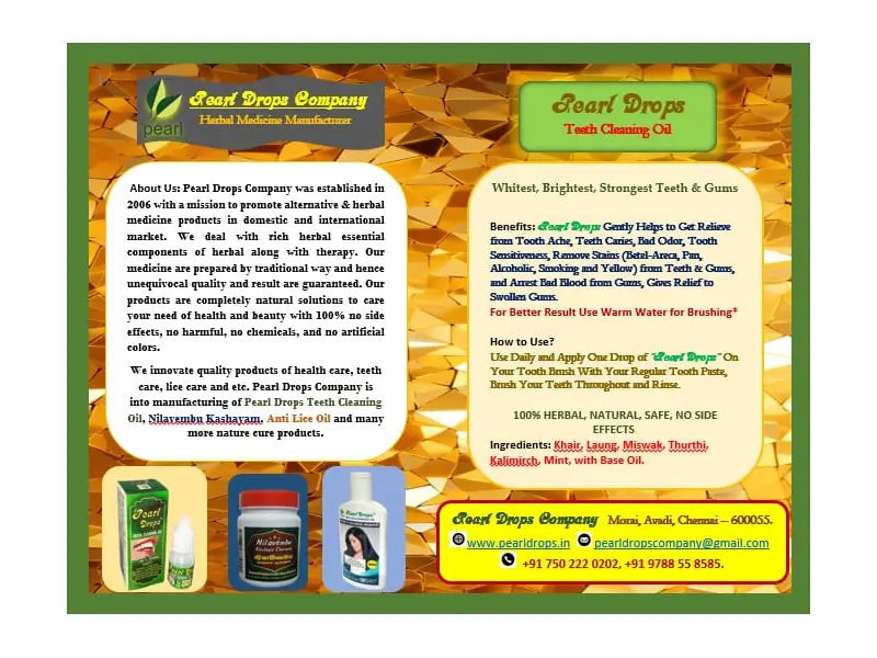 We innovate quality products of Health care, Teeth care and etc. Pearl Drops Company is into manufacturing of Pearl Drops Teeth Cleaning Oil, Nilavembu Kashayam, Pearl Drops Anti Lice Oil and many more nature cure product.